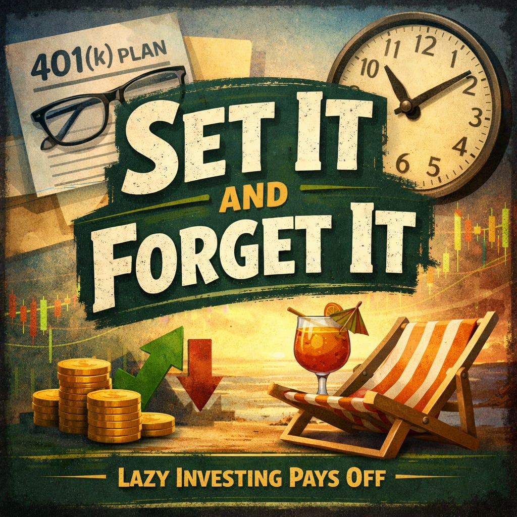 I was recently poking around in my employer-sponsored 401(k) plan. I don’t do it much; I sorta do the whole “set it, and forget it.” You would think that the conventional wisdom is that a person should be me, watching and fiddling with investments constantly. I’ve had many a conversation with persons who do just that.