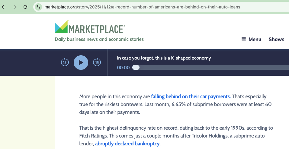 A recession isn’t here, but car loan stress is. Doesn’t take rocket science to figure this one out. The same people are buried under student loans, credit card debt, and mortgage payments that are too high. Can’t afford that car? Surprise, surprise.