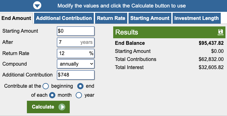 Starting from zero, $748 a month, over seven years. $100gs, just like that. Gone, forever, over a lifetime, it’s actually quite insane. Most people have car payments for their entire young and middle adult life.